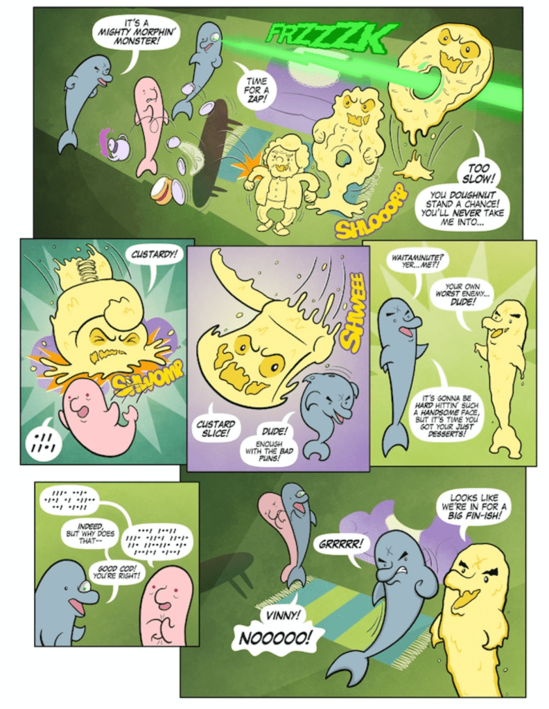 - Fabian – Where Vinny and Lazer-Eye are the brawn and brains of Dolphin Squad, Fabian is their heart and holds the team together. He’s also a tech-wizard: if it involves disarming bombs, hacking into computer networks, or remembering obscure trivia from forgotten TV shows, Fabian’s your dolphin! The only thing Fabian can’t seem to do is learn human language.